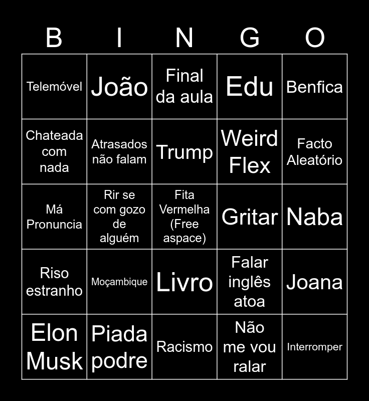 This bingo card has a free space and 24 words: Moçambique, Piada podre, Trump, Elon Musk, Benfica, Telemóvel, Chateada com nada, João, Gritar, Livro, Weird Flex, Má Pronuncia, Falar inglês atoa, Joana, Atrasados não falam, Não me vou ralar, Naba, Final da aula, Facto Aleatório, Rir se com gozo de alguém, Interromper, Riso estranho, Edu and Racismo.