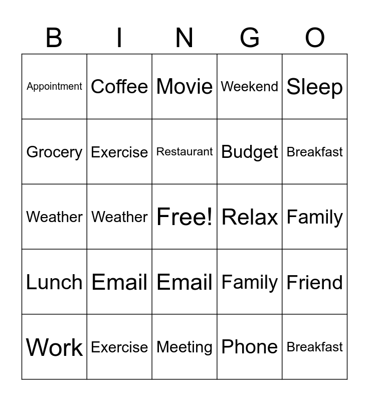 This bingo card has a free space and 48 words: Morning, Breakfast, Work, Meeting, Email, Lunch, Coffee, Commute, Grocery, Shopping, Exercise, Weekend, Friend, Family, Hobby, Travel, Restaurant, Relax, Movie, Sleep, Weather, Phone, Appointment, Budget, Morning, Breakfast, Work, Meeting, Email, Lunch, Coffee, Commute, Grocery, Shopping, Exercise, Weekend, Friend, Family, Hobby, Travel, Restaurant, Relax, Movie, Sleep, Weather, Phone, Appointment and Budget.