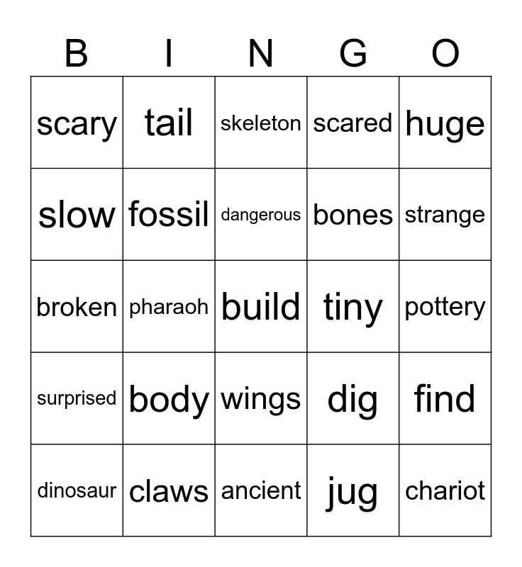 This bingo card has a free space and 24 words: body, claws, dangerous, dinosaur, huge, scary, slow, tail, tiny, wings, bones, broken, dig, find, fossil, jug, pottery, skeleton, strange, pharaoh, chariot, surprised, scared and ancient.