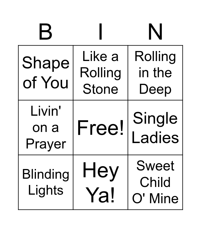 This bingo card has a free space and 16 words: Bohemian Rhapsody, Uptown Funk, Rolling in the Deep, Shape of You, Billie Jean, Like a Rolling Stone, Thriller, Don't Stop Believin', Sweet Child O' Mine, Single Ladies, Smells Like Teen Spirit, Livin' on a Prayer, I Wanna Dance with Somebody, Hey Ya!, Blinding Lights and Dancing Queen.