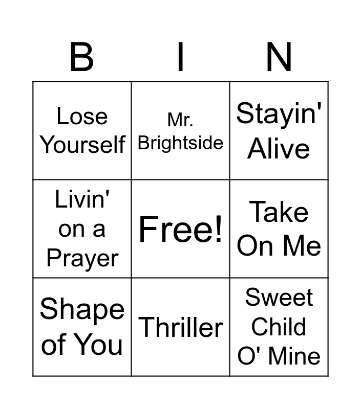 This bingo card has a free space and 39 words: Bohemian Rhapsody, Uptown Funk, Rolling in the Deep, Shape of You, Billie Jean, Like a Rolling Stone, Thriller, Don't Stop Believin', Sweet Child O' Mine, Single Ladies, Smells Like Teen Spirit, Livin' on a Prayer, I Wanna Dance with Somebody, Hey Ya!, Blinding Lights, Dancing Queen, Africa, Lose Yourself, Paint It Black, All of Me, Take On Me, Shake It Off, Boogie Wonderland, Jailhouse Rock, Imagine, Happy, Respect, I Will Survive, My Heart Will Go On, Mr. Brightside, Born to Run, We Are the Champions, Stayin' Alive, Wonderwall, The Way You Make Me Feel, All Star, Sweet Home Alabama, Don't Stop Me Now and Let It Be.