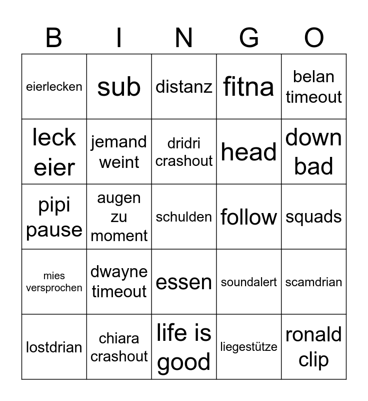 This bingo card has a free space and 24 words: dwayne timeout, chiara crashout, dridri crashout, lostdrian, belan timeout, eierlecken, leck eier, sub, follow, essen, head, pipi pause, soundalert, scamdrian, jemand weint, liegestütze, squads, distanz, down bad, augen zu moment, ronald clip, mies versprochen, fitna and life is good.