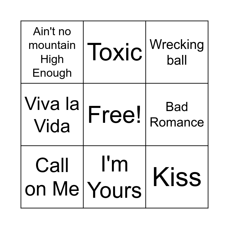 This bingo card has a free space and 28 words: September, Shallow, Dynamite, Backstreet's back, Bad Romance, Wrecking ball, Toxic, Gangnam Style, Take a Bow, The Macarena, Vogue, Viva la Vida, Somebody to love, The Middle, Hey Jude, All I want for Christmas, Call me Maybe, Call on Me, I'm Yours, Superstition, Ain't no mountain High Enough, Hound Dog, Happy Together, No Scrubs, I knew you were trouble, Mr Roboto, Kiss and Take me home country roads.