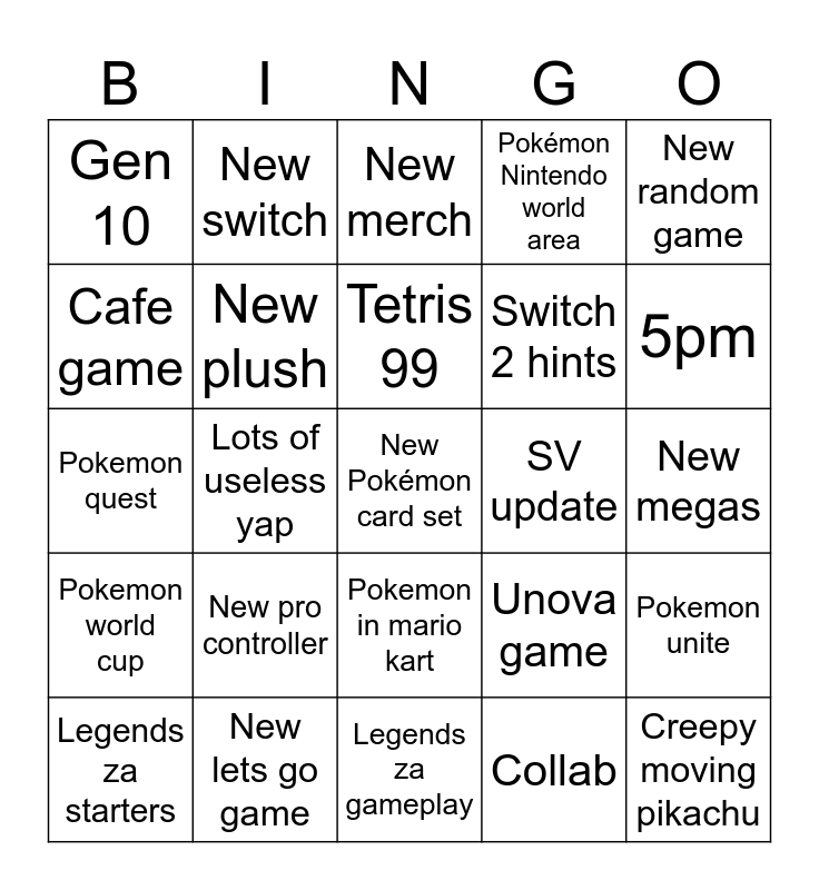 This bingo card has 25 words: Pokemon world cup, New lets go game, New Pokémon card set, Collab, New random game, Gen 10, New switch, New merch, SV update, Pokemon unite, Cafe game, New plush, Legends za gameplay, Unova game, 5pm, Legends za starters, Lots of useless yap, Tetris 99, Switch 2 hints, New megas, Pokemon quest, New pro controller, Pokemon in mario kart, Pokémon Nintendo world area and Creepy moving pikachu.