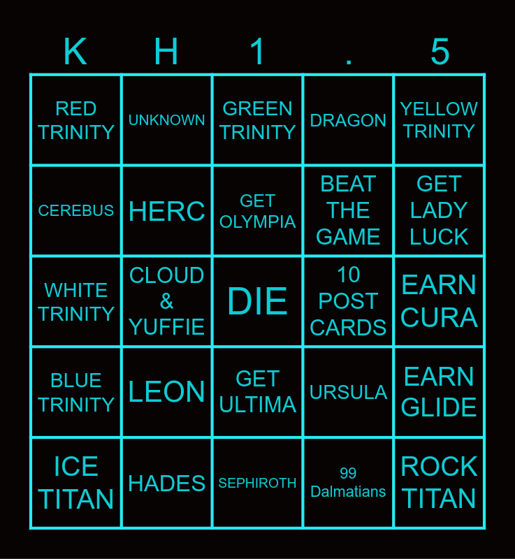 This bingo card has a free space and 24 words: LEON, HADES, GET OLYMPIA, ICE TITAN, YELLOW TRINITY, RED TRINITY, CEREBUS, UNKNOWN, 10 POST CARDS, GET ULTIMA, BEAT THE GAME, WHITE TRINITY, URSULA, EARN GLIDE, HERC, 99 Dalmatians, EARN CURA, GREEN TRINITY, GET LADY LUCK, CLOUD & YUFFIE, ROCK TITAN, BLUE TRINITY, DRAGON and SEPHIROTH.