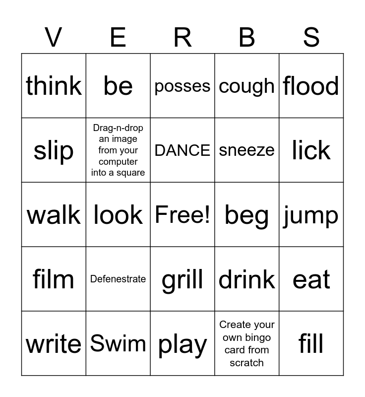 This bingo card has a free space and 24 words: Defenestrate, Swim, DANCE, write, flood, think, slip, be, beg, grill, sneeze, walk, drink, eat, Drag-n-drop an image from your computer into a square, Create your own bingo card from scratch, jump, posses, lick, look, fill, film, cough and play.
