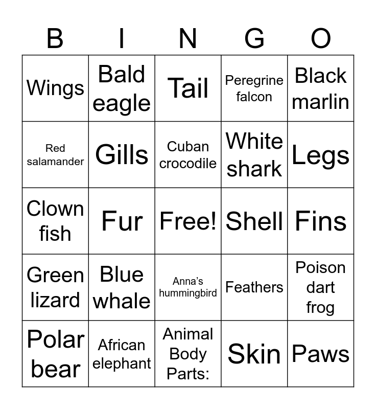 This bingo card has a free space and 31 words: Animal Body Parts:, Beak, Fur, Claws, Wings, Tail, Gills, Feathers, Shell, Skin, Fins, Paws, Talons, Jaws, Legs, Animals:, Poison dart frog, Blue whale, Green lizard, Anna’s hummingbird, Black marlin, Green sea turtle, Polar bear, Bald eagle, White shark, Red salamander, Peregrine falcon, Clown fish, African elephant, Cuban crocodile and American toad.