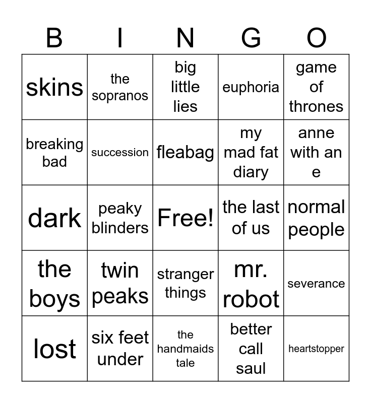 This bingo card has a free space and 24 words: twin peaks, six feet under, fleabag, lost, game of thrones, skins, breaking bad, the sopranos, the last of us, stranger things, my mad fat diary, dark, mr. robot, severance, succession, better call saul, normal people, big little lies, anne with an e, peaky blinders, heartstopper, the boys, euphoria and the handmaids tale.