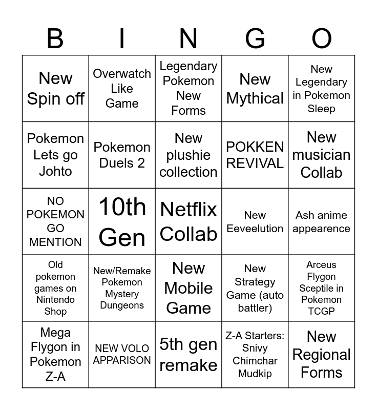 This bingo card has a free space and 24 words: New/Remake Pokemon Mystery Dungeons, NEW VOLO APPARISON, New plushie collection, Mega Flygon in Pokemon Z-A, New Legendary in Pokemon Sleep, New Spin off, Pokemon Lets go Johto, Overwatch Like Game, New Eeveelution, New Mobile Game, POKKEN REVIVAL, NO POKEMON GO MENTION, New Strategy Game (auto battler), Arceus Flygon Sceptile in Pokemon TCGP, Pokemon Duels 2, Z-A Starters: Snivy Chimchar Mudkip, Ash anime appearence, Legendary Pokemon New Forms, New musician Collab, 10th Gen, New Regional Forms, Old pokemon games on Nintendo Shop, New Mythical and 5th gen remake.