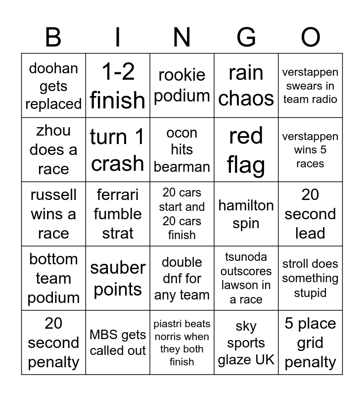 This bingo card has a free space and 24 words: sauber points, MBS gets called out, ocon hits bearman, 20 second penalty, verstappen swears in team radio, doohan gets replaced, zhou does a race, 1-2 finish, hamilton spin, double dnf for any team, red flag, russell wins a race, tsunoda outscores lawson in a race, stroll does something stupid, turn 1 crash, sky sports glaze UK, 20 second lead, rookie podium, verstappen wins 5 races, ferrari fumble strat, 5 place grid penalty, bottom team podium, rain chaos and piastri beats norris when they both finish.