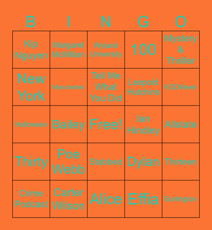 This bingo card has a free space and 24 words: Poe Webb, Carter Wilson, Tell Me What You Did, Crime Podcast, Mystery & Thriller, Kip Nguyen, New York, Margaret McMillian, Ian Hindley, Stabbed, Leopold Hutchins, Halloween, Dylan, Thirteen, Manchester, Effia, Allstate, Wyland University, KOD4ever, Bailey, Burlington, Thirty, 100 and Alice.