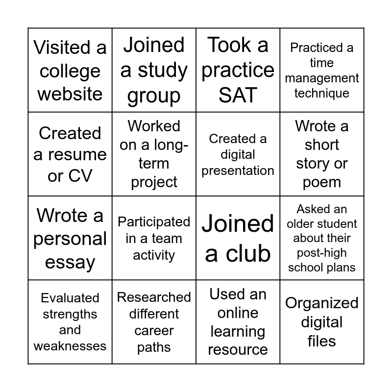 This bingo card has 16 words: Researched different career paths, Asked an older student about their post-high school plans, Took a practice SAT, Visited a college website, Wrote a personal essay, Joined a study group, Joined a club, Used an online learning resource, Created a resume or CV, Worked on a long-term project, Evaluated strengths and weaknesses, Practiced a time management technique, Participated in a team activity, Wrote a short story or poem, Created a digital presentation and Organized digital files.