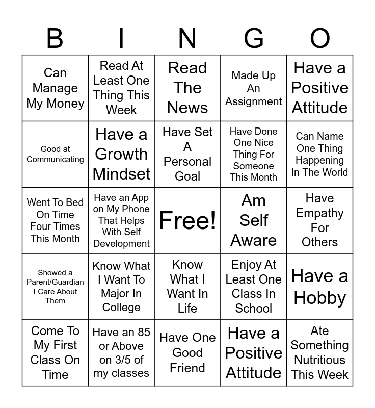 This bingo card has a free space and 24 words: Know What I Want To Major In College, Have an 85 or Above on 3/5 of my classes, Have Set A Personal Goal, Come To My First Class On Time, Have a Positive Attitude, Can Manage My Money, Good at Communicating, Read At Least One Thing This Week, Am Self Aware, Know What I Want In Life, Have Done One Nice Thing For Someone This Month, Went To Bed On Time Four Times This Month, Enjoy At Least One Class In School, Have a Hobby, Have a Growth Mindset, Have a Positive Attitude, Have Empathy For Others, Read The News, Can Name One Thing Happening In The World, Have an App on My Phone That Helps With Self Development, Ate Something Nutritious This Week, Showed a Parent/Guardian I Care About Them, Made Up An Assignment and Have One Good Friend.