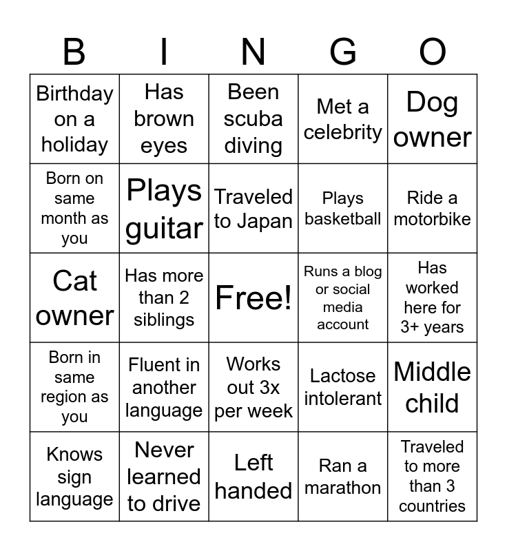 This bingo card has a free space and 24 words: Fluent in another language, Never learned to drive, Traveled to Japan, Knows sign language, Dog owner, Birthday on a holiday, Born on same month as you, Has brown eyes, Runs a blog or social media account, Works out 3x per week, Plays basketball, Cat owner, Lactose intolerant, Middle child, Plays guitar, Ran a marathon, Has worked here for 3+ years, Been scuba diving, Ride a motorbike, Has more than 2 siblings, Traveled to more than 3 countries, Born in same region as you, Met a celebrity and Left handed.