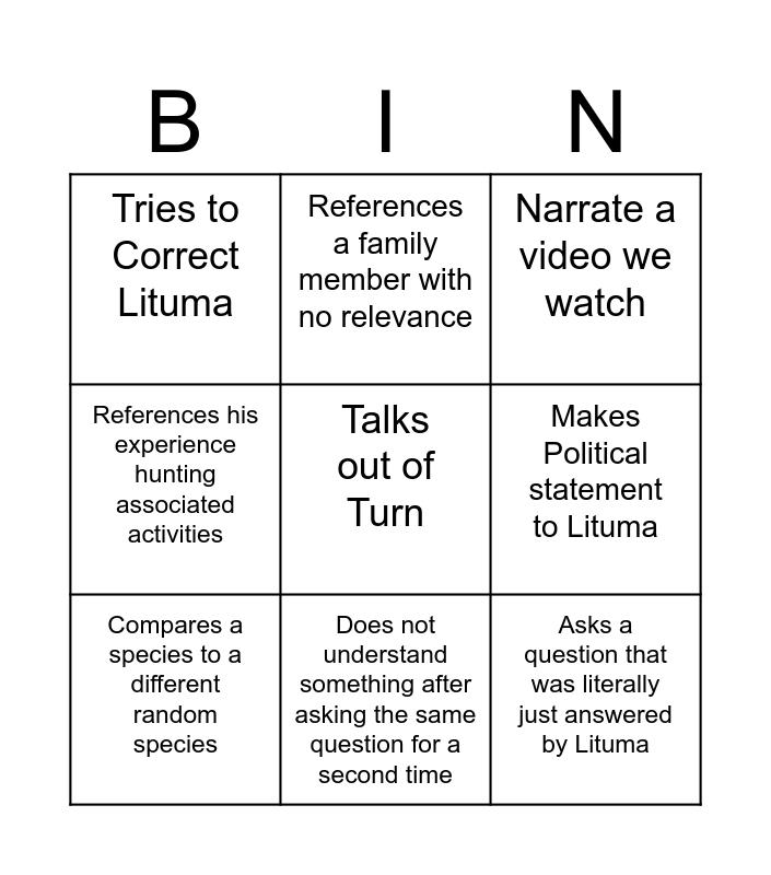 This bingo card has a free space and 8 words: Makes Political statement to Lituma, Narrate a video we watch, References a family member with no relevance, Compares a species to a different random species, Tries to Correct Lituma, Asks a question that was literally just answered by Lituma, References his experience hunting associated activities and Does not understand something after asking the same question for a second time.
