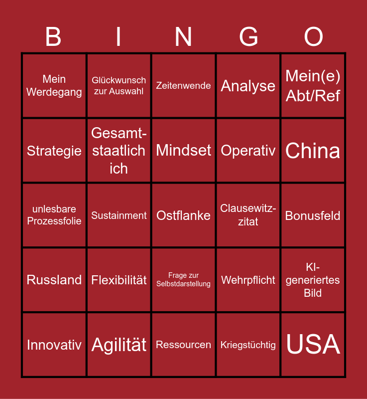 This bingo card has a free space and 24 words: Innovativ, Flexibilität, Mindset, Kriegstüchtig, Mein(e) Abt/Ref, Mein Werdegang, Glückwunsch zur Auswahl, Zeitenwende, Clausewitz- zitat, Bonusfeld, unlesbare Prozessfolie, Gesamt- staatlich ich, Wehrpflicht, KI-generiertes Bild, Strategie, Agilität, Ressourcen, Analyse, China, Russland, Sustainment, Frage zur Selbstdarstellung, Operativ and USA.
