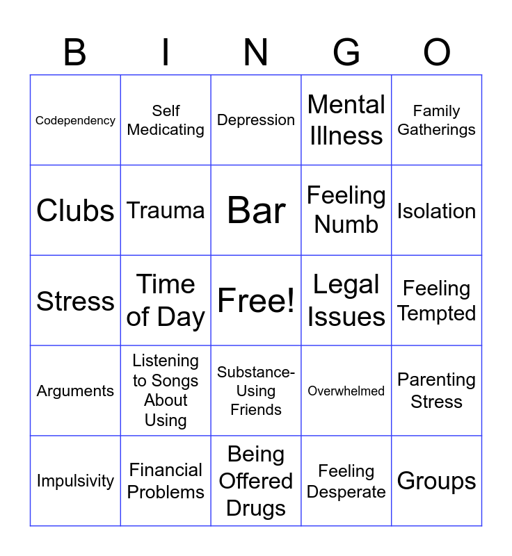 This bingo card has a free space and 77 words: Paranoia, Boredom, Depression, Anger, Frustration, Family, Old Friends, Other Users, Baby Mama, Baby Daddy, Exes, Friend's House, Bar, Clubs, Homeless Shelters, Time of Day, Parties, Groups, Meetings, Family Gatherings, Money, Stress, Trauma, Self Medicating, Mental Illness, Anxiety, Loss, Chasing the High, Hungry, Lonely, Tired, Emotions, Cravings, Overwhelmed, Isolation, Feeling Numb, Feeling Trapped, Feeling Powerless, Feeling Tempted, Feeling Desperate, Social Isolation, Physical Illness, Being Around Alcohol, Unstructured Free Time, No Support System, Withdrawal Symptoms, Impulsivity, Codependency, Low Self-Esteem, Lack of Purpose, Reminiscing About the Past, Substance-Using Friends, Seeing Someone Using, Guilt/Shame, Overconfidence, Peer Pressure, Celebrations, Sudden Freedom, Feeling Hopeless, Watching TV Shows with Drug Use, Listening to Songs About Using, Seeing Old Drug Spots, Relationship Issues, Seeing Someone from Past Lifestyle, Guilt, Shame, Stress at Work, Legal Issues, Medical Problems, Breakups, Divorce, Parenting Stress, Arguments, Financial Problems, Losing a Job, Being Offered Drugs and Lack of Sleep.
