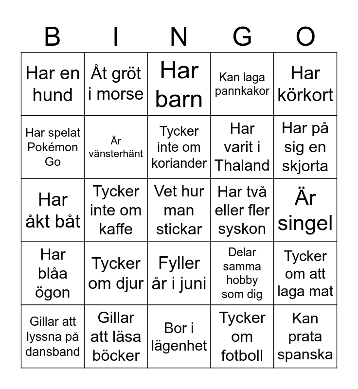 This bingo card has 30 words: Gillar att läsa böcker, Tycker om att äta hamburgare, Tycker inte om kaffe, Har på sig vita strumpor, Har en hund, Har barn, Är vänsterhänt, Fyller år i juni, Har två eller fler syskon, Bor i lägenhet, Är singel, Vet hur man stickar, Tycker om fotboll, Kan prata spanska, Har på sig en skjorta, Är medlem i en förening, Delar samma hobby som dig, Har blåa ögon, Tycker om djur, Har körkort, Har åkt båt, Tycker om "på spåret", Åt gröt i morse, Har varit i Thaland, Har spelat Pokémon Go, Kan laga pannkakor, Tycker om att laga mat, Gillar att lyssna på dansband, Tycker inte om koriander and Tycker inte om att mingla.