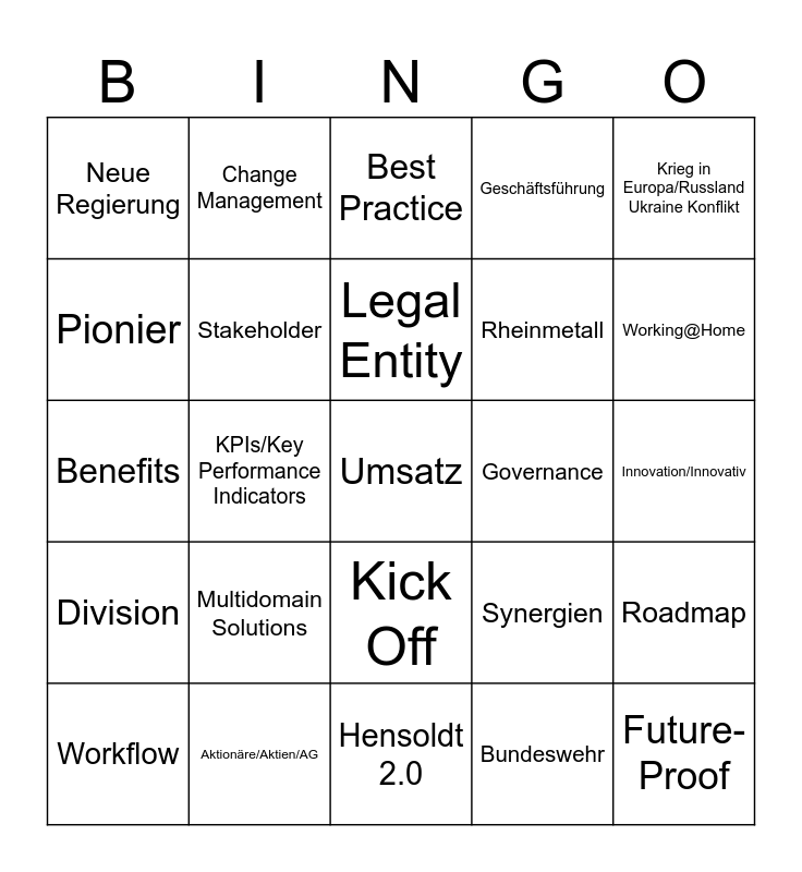 This bingo card has 25 words: Multidomain Solutions, Hensoldt 2.0, Legal Entity, Workflow, Krieg in Europa/Russland Ukraine Konflikt, Neue Regierung, Pionier, Change Management, Governance, Kick Off, Rheinmetall, Benefits, Synergien, Roadmap, Stakeholder, Future-Proof, Innovation/Innovativ, Best Practice, Working@Home, KPIs/Key Performance Indicators, Umsatz, Aktionäre/Aktien/AG, Division, Geschäftsführung and Bundeswehr.