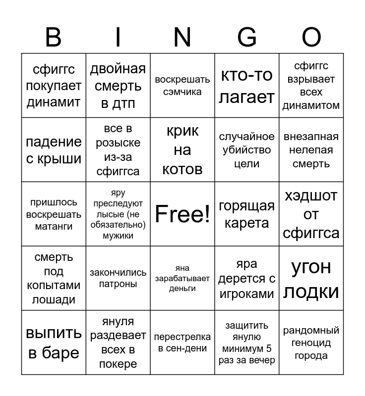 This bingo card has a free space and 24 words: закончились патроны, януля раздевает всех в покере, крик на котов, выпить в баре, сфиггс взрывает всех динамитом, сфиггс покупает динамит, падение с крыши, двойная смерть в дтп, горящая карета, яна зарабатывает деньги, случайное убийство цели, пришлось воскрешать матанги, яра дерется с игроками, угон лодки, все в розыске из-за сфиггса, защитить янулю минимум 5 раз за вечер, хэдшот от сфиггса, воскрешать сэмчика, внезапная нелепая смерть, яру преследуют лысые (не обязательно) мужики, рандомный геноцид города, смерть под копытами лошади, кто-то лагает and перестрелка в сен-дени.
