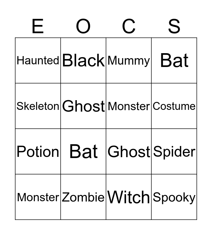 ⚠ This card has duplicate items: Ghost (2), Goblins (2), Monster (2), Trick (2), Treat (2), Costume (2), Skeleton (2), Spooky (2), Spider (2), Bat (2), Witch (2), Zombie (2), Black (2), Orange (2), Haunted (2), Boo (2)