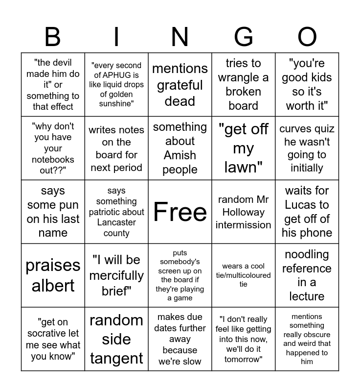 This bingo card has a free space and 24 words: "I will be mercifully brief", random side tangent, something about Amish people, "get on socrative let me see what you know", "you're good kids so it's worth it", "the devil made him do it" or something to that effect, "why don't you have your notebooks out??", "every second of APHUG is like liquid drops of golden sunshine", random Mr Holloway intermission, puts somebody's screen up on the board if they're playing a game, "get off my lawn", says some pun on his last name, wears a cool tie/multicoloured tie, noodling reference in a lecture, writes notes on the board for next period, "I don't really feel like getting into this now, we'll do it tomorrow", waits for Lucas to get off of his phone, mentions grateful dead, curves quiz he wasn't going to initially, says something patriotic about Lancaster county, mentions something really obscure and weird that happened to him, praises albert, tries to wrangle a broken board and makes due dates further away because we're slow.