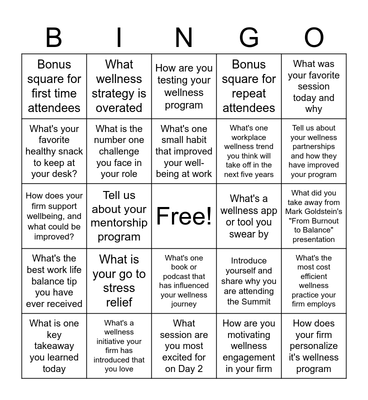 This bingo card has a free space and 24 words: What is your go to stress relief, What's a wellness initiative your firm has introduced that you love, What's one small habit that improved your well-being at work, What is one key takeaway you learned today, What was your favorite session today and why, Bonus square for first time attendees, What's your favorite healthy snack to keep at your desk?, What wellness strategy is overated, What's a wellness app or tool you swear by, What's one book or podcast that has influenced your wellness journey, What's one workplace wellness trend you think will take off in the next five years, How does your firm support wellbeing, and what could be improved?, Introduce yourself and share why you are attending the Summit, What's the most cost efficient wellness practice your firm employs, What is the number one challenge you face in your role, How are you motivating wellness engagement in your firm, What did you take away from Mark Goldstein's "From Burnout to Balance" presentation, How are you testing your wellness program, Tell us about your wellness partnerships and how they have improved your program, Tell us about your mentorship program, How does your firm personalize it's wellness program, What's the best work life balance tip you have ever received, Bonus square for repeat attendees and What session are you most excited for on Day 2.