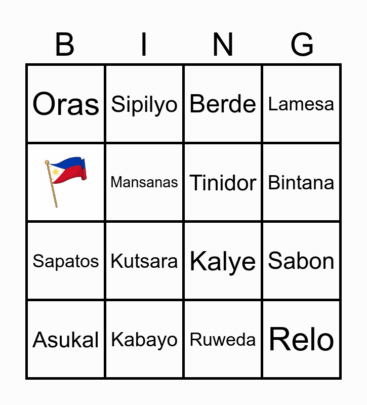 This bingo card has 1 images and 15 words: Kabayo, Sabon, Berde, Oras, Sapatos, Sipilyo, Kalye, Ruweda, Mansanas, Asukal, Lamesa, Kutsara, Bintana, Tinidor and Relo.