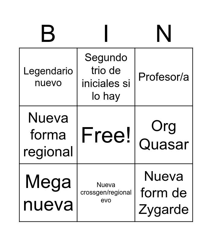 This bingo card has a free space and 8 words: Org Quasar, Profesor/a, Segundo trio de iniciales si lo hay, Mega nueva, Legendario nuevo, Nueva form de Zygarde, Nueva forma regional and Nueva crossgen/regional evo.