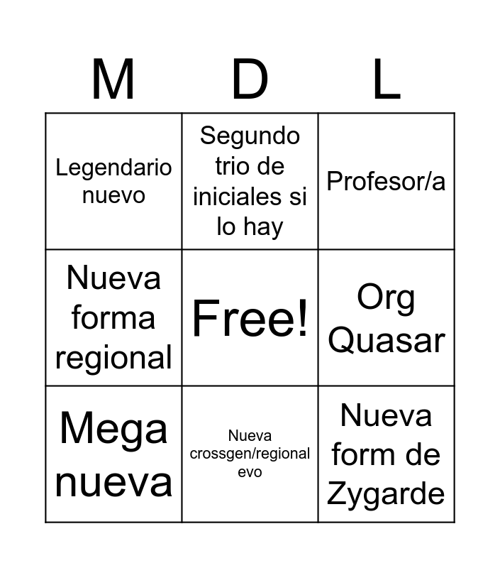 This bingo card has a free space and 8 words: Org Quasar, Profesor/a, Segundo trio de iniciales si lo hay, Mega nueva, Legendario nuevo, Nueva form de Zygarde, Nueva forma regional and Nueva crossgen/regional evo.