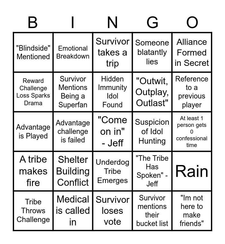 This bingo card has a free space and 24 words: Shelter Building Conflict, Medical is called in, Hidden Immunity Idol Found, Tribe Throws Challenge, Alliance Formed in Secret, "Blindside" Mentioned, Reward Challenge Loss Sparks Drama, Emotional Breakdown, Suspicion of Idol Hunting, Underdog Tribe Emerges, "Outwit, Outplay, Outlast", Advantage is Played, "The Tribe Has Spoken" - Jeff, Rain, Survivor Mentions Being a Superfan, Survivor mentions their bucket list, At least 1 person gets 0 confessional time, Survivor takes a trip, Reference to a previous player, Advantage challenge is failed, "Im not here to make friends", A tribe makes fire, Someone blatantly lies and Survivor loses vote.