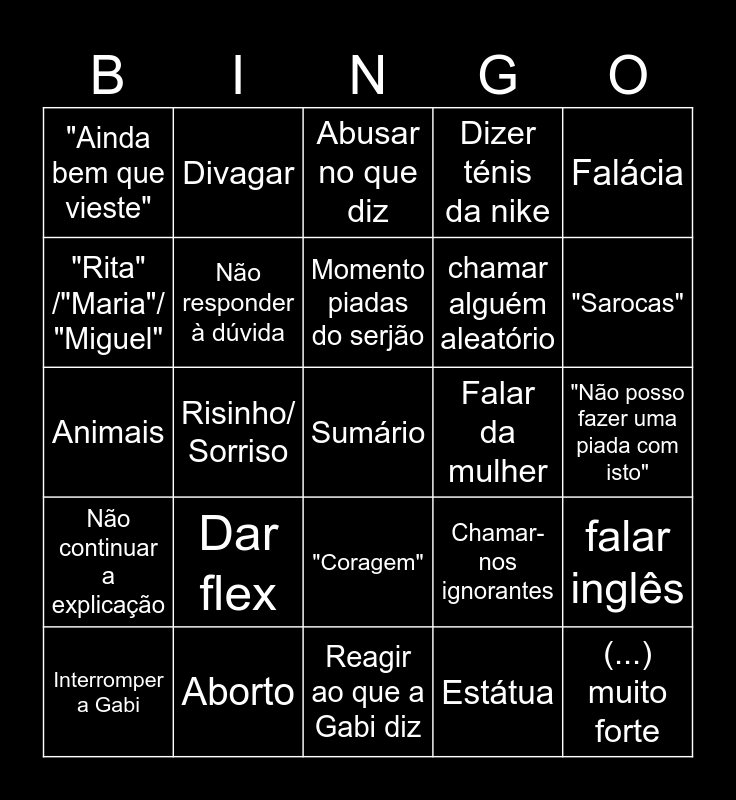 This bingo card has a free space and 34 words: Perder-se, Estátua, Deus, origens das palavras, Não continuar a explicação, Não responder à dúvida, Falácia, Interromper a Gabi, Divagar, Falar sozinho, Momento piadas do serjão, Abusar no que diz, Momento discussão com o stor, Falar dos 3000 filhos, Falar da mulher, "Sarocas", Aborto, Animais, Dar flex, Chamar-nos ignorantes, "Coragem", "Obrigado por terem vindo", "Ainda bem que vieste", "Não posso fazer uma piada com isto", Reagir ao que a Gabi diz, (...) muito forte, Dizer ténis da nike, Longchamps, chamar alguém aleatório, "Rita" /"Maria"/ "Miguel", "Fantástico", Risinho/ Sorriso, falar inglês and "Não se magoem".