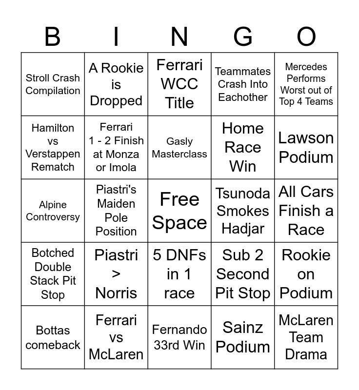 This bingo card has a free space and 24 words: Piastri > Norris, Ferrari vs McLaren, Gasly Masterclass, Bottas comeback, Mercedes Performs Worst out of Top 4 Teams, Stroll Crash Compilation, Hamilton vs Verstappen Rematch, A Rookie is Dropped, Tsunoda Smokes Hadjar, 5 DNFs in 1 race, Home Race Win, Alpine Controversy, Sub 2 Second Pit Stop, Rookie on Podium, Ferrari 1 - 2 Finish at Monza or Imola, Sainz Podium, All Cars Finish a Race, Ferrari WCC Title, Lawson Podium, Piastri's Maiden Pole Position, McLaren Team Drama, Botched Double Stack Pit Stop, Teammates Crash Into Eachother and Fernando 33rd Win.