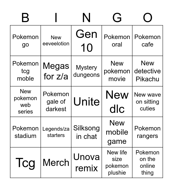 This bingo card has a free space and 24 words: Legends/za starters, Merch, Mystery dungeons, Tcg, Pokemon cafe, Pokemon go, Pokemon tcg moble, New eeveelotion, New dlc, Silksong in chat, New pokemon movie, New pokemon web series, New mobile game, Pokemon rangers, Megas for z/a, New life size pokemon plushie, New wave on sitting cuties, Gen 10, New detective Pikachu, Pokemon gale of darkest, Pokemon on the online thing, Pokemon stadium, Pokemon oral and Unova remix.
