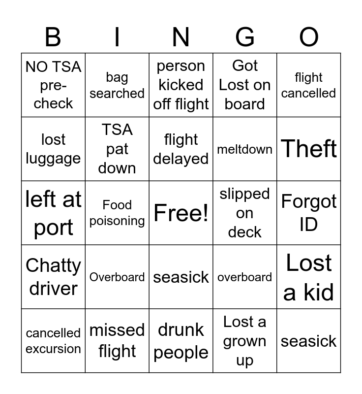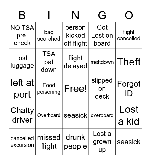 This bingo card has a free space and 24 words: Overboard, missed flight, flight delayed, cancelled excursion, flight cancelled, NO TSA pre-check, lost luggage, bag searched, slipped on deck, seasick, meltdown, left at port, overboard, Lost a kid, TSA pat down, Lost a grown up, Forgot ID, person kicked off flight, Theft, Food poisoning, seasick, Chatty driver, Got Lost on board and drunk people.