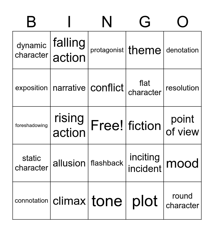 This bingo card has a free space and 24 words: allusion, climax, conflict, connotation, denotation, dynamic character, exposition, falling action, fiction, flashback, flat character, foreshadowing, inciting incident, mood, narrative, plot, point of view, protagonist, resolution, rising action, round character, static character, theme and tone.