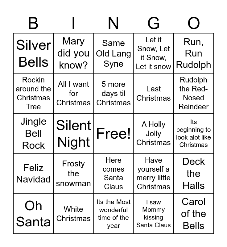 This bingo card has a free space and 24 words: Frosty the snowman, White Christmas, 5 more days til Christmas, Oh Santa, Run, Run Rudolph, Silver Bells, Rockin around the Christmas Tree, Mary did you know?, A Holly Jolly Christmas, Here comes Santa Claus, Last Christmas, Jingle Bell Rock, Have yourself a merry little Christmas, Deck the Halls, All I want for Christmas, I saw Mommy kissing Santa Claus, Its beginning to look alot like Christmas, Same Old Lang Syne, Rudolph the Red-Nosed Reindeer, Silent Night, Carol of the Bells, Feliz Navidad, Let it Snow, Let it Snow, Let it snow and Its the Most wonderful time of the year.