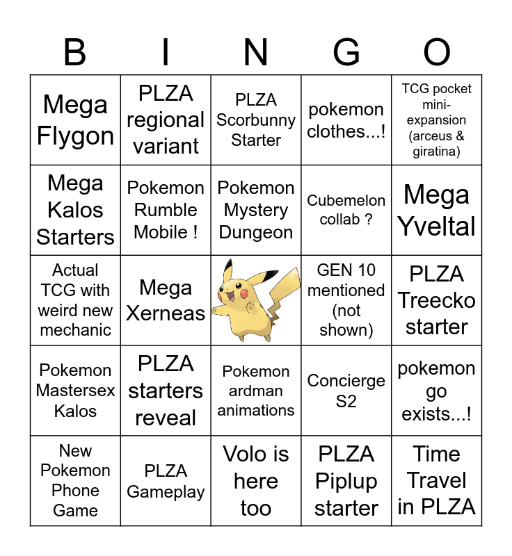 This bingo card has a free space and 24 words: PLZA starters reveal, PLZA Gameplay, Pokemon Mystery Dungeon, New Pokemon Phone Game, TCG pocket mini-expansion (arceus & giratina), Mega Flygon, Mega Kalos Starters, PLZA regional variant, GEN 10 mentioned (not shown), Pokemon ardman animations, Cubemelon collab ?, Actual TCG with weird new mechanic, Concierge S2, pokemon go exists...!, Pokemon Rumble Mobile !, PLZA Piplup starter, PLZA Treecko starter, PLZA Scorbunny Starter, Mega Yveltal, Mega Xerneas, Time Travel in PLZA, Pokemon Mastersex Kalos, pokemon clothes...! and Volo is here too.