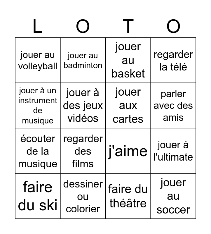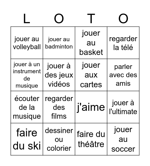 This bingo card has 19 words: j'aime, je n'aime pas, jouer au basket, jouer au soccer, jouer à l'ultimate, jouer à un instrument de musique, faire du théâtre, jouer au volleyball, jouer au badminton, écouter de la musique, regarder des films, jouer à des jeux vidéos, jouer aux cartes, dessiner ou colorier, faire du ski, faire du toboggan, regarder la télé, parler avec des amis and jouer dans la neige.