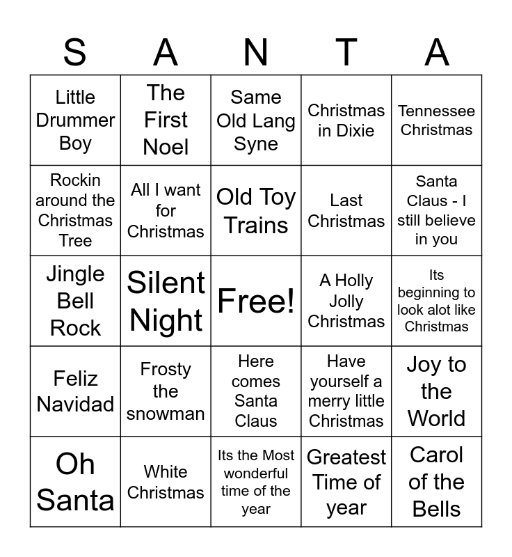 This bingo card has a free space and 24 words: Frosty the snowman, White Christmas, Old Toy Trains, Oh Santa, Tennessee Christmas, Little Drummer Boy, Rockin around the Christmas Tree, The First Noel, A Holly Jolly Christmas, Here comes Santa Claus, Last Christmas, Jingle Bell Rock, Have yourself a merry little Christmas, Joy to the World, All I want for Christmas, Greatest Time of year, Its beginning to look alot like Christmas, Same Old Lang Syne, Santa Claus - I still believe in you, Silent Night, Carol of the Bells, Feliz Navidad, Christmas in Dixie and Its the Most wonderful time of the year.