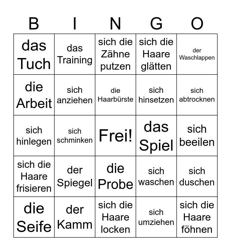 This bingo card has a free space and 24 words: der Spiegel, der Kamm, die Haarbürste, die Seife, der Waschlappen, das Tuch, die Arbeit, das Training, das Spiel, die Probe, sich hinsetzen, sich hinlegen, sich waschen, sich duschen, sich anziehen, sich umziehen, sich beeilen, sich die Zähne putzen, sich abtrocknen, sich schminken, sich die Haare föhnen, sich die Haare frisieren, sich die Haare glätten and sich die Haare locken.