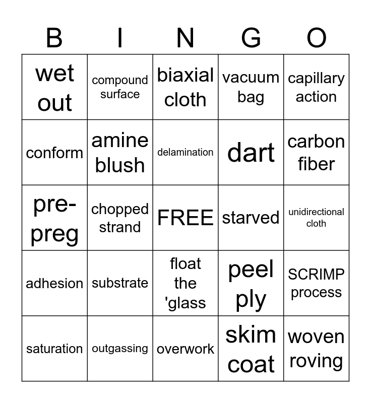 This bingo card has a free space and 24 words: substrate, outgassing, delamination, saturation, capillary action, wet out, conform, compound surface, starved, float the 'glass, dart, pre-preg, peel ply, SCRIMP process, amine blush, skim coat, unidirectional cloth, biaxial cloth, carbon fiber, chopped strand, woven roving, adhesion, vacuum bag and overwork.