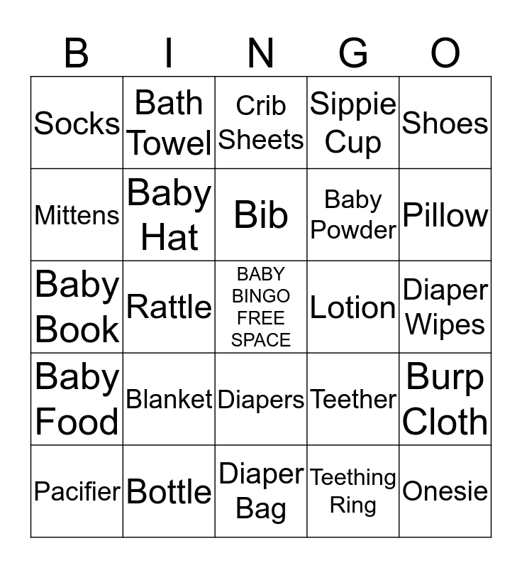 This bingo card has a free space and 24 words: Blanket, Bottle, Bib, Pacifier, Shoes, Socks, Mittens, Bath Towel, Lotion, Diapers, Baby Powder, Baby Book, Teether, Burp Cloth, Baby Hat, Teething Ring, Diaper Wipes, Crib Sheets, Pillow, Rattle, Onesie, Baby Food, Sippie Cup and Diaper Bag.