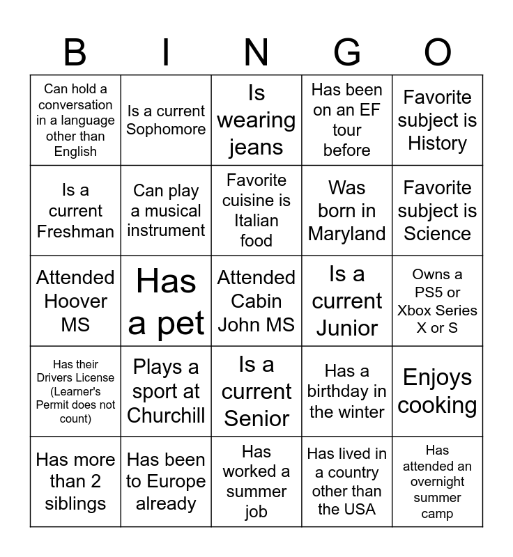 This bingo card has a free space and 24 words: Plays a sport at Churchill, Has been to Europe already, Favorite cuisine is Italian food, Has more than 2 siblings, Favorite subject is History, Can hold a conversation in a language other than English, Is a current Freshman, Is a current Sophomore, Is a current Junior, Is a current Senior, Was born in Maryland, Attended Hoover MS, Has a birthday in the winter, Enjoys cooking, Can play a musical instrument, Has lived in a country other than the USA, Owns a PS5 or Xbox Series X or S, Is wearing jeans, Favorite subject is Science, Has a pet, Has attended an overnight summer camp, Has their Drivers License (Learner's Permit does not count), Has been on an EF tour before and Has worked a summer job.