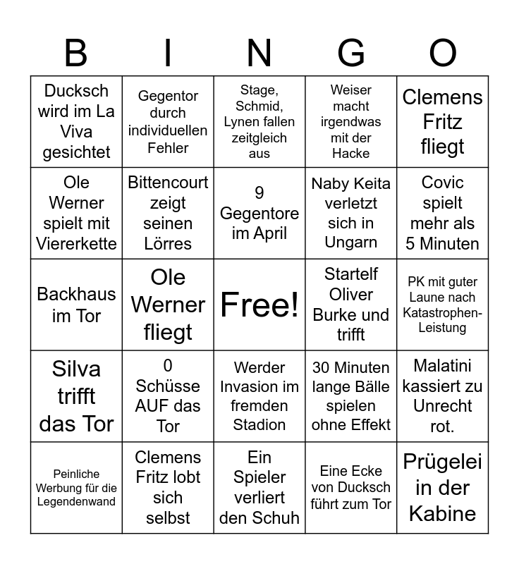 This bingo card has a free space and 24 words: 0 Schüsse AUF das Tor, Clemens Fritz lobt sich selbst, 9 Gegentore im April, Peinliche Werbung für die Legendenwand, Clemens Fritz fliegt, Ducksch wird im La Viva gesichtet, Ole Werner spielt mit Viererkette, Gegentor durch individuellen Fehler, Startelf Oliver Burke und trifft, Werder Invasion im fremden Stadion, Naby Keita verletzt sich in Ungarn, Backhaus im Tor, 30 Minuten lange Bälle spielen ohne Effekt, Malatini kassiert zu Unrecht rot., Bittencourt zeigt seinen Lörres, Eine Ecke von Ducksch führt zum Tor, PK mit guter Laune nach Katastrophen- Leistung, Stage, Schmid, Lynen fallen zeitgleich aus, Covic spielt mehr als 5 Minuten, Ole Werner fliegt, Prügelei in der Kabine, Silva trifft das Tor, Weiser macht irgendwas mit der Hacke and Ein Spieler verliert den Schuh.