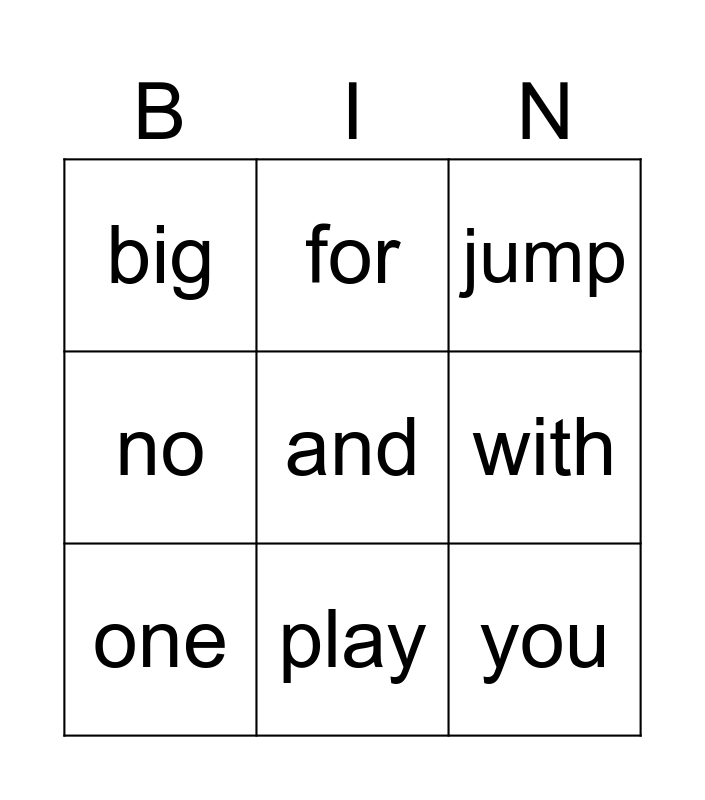 This bingo card has 9 words: one, jump, for, no, big, with, and, you and play.