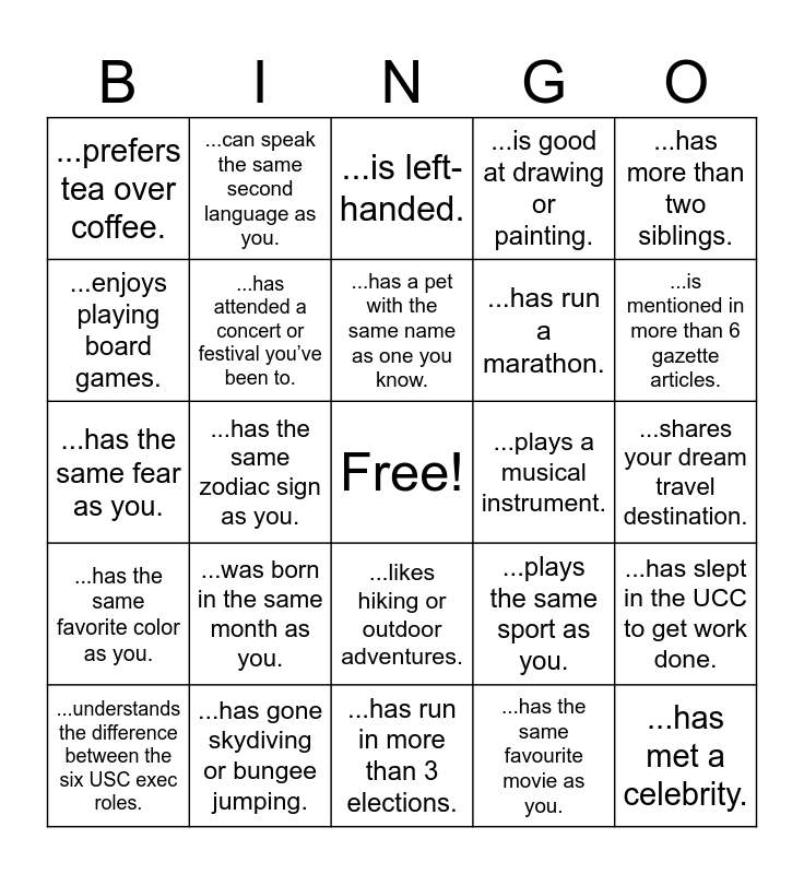 This bingo card has a free space and 30 words: ...has gone skydiving or bungee jumping., ...shares your favorite music genre., ...has the same zodiac sign as you., ...has performed on stage before., ...prefers tea over coffee., ...is left-handed., ...has attended a concert or festival you’ve been to., ...likes hiking or outdoor adventures., ...plays a musical instrument., ...has run in more than 3 elections., ...shares your dream travel destination., ...has met a celebrity., ...has the same favourite movie as you., ...writes stories or poetry., ...is mentioned in more than 6 gazette articles., ...has traveled to the same country as you., ...plays the same sport as you., ...has the same favorite color as you., ...was born in the same month as you., ...has more than two siblings., ...has the same fear as you., ...loves pineapple on pizza., ...can speak the same second language as you., ...has run a marathon., ...enjoys playing board games., ...is good at drawing or painting., ...has slept in the UCC to get work done., ...understands the difference between the six USC exec roles., ...has a pet with the same name as one you know. and ...has been to every council meeting this year..