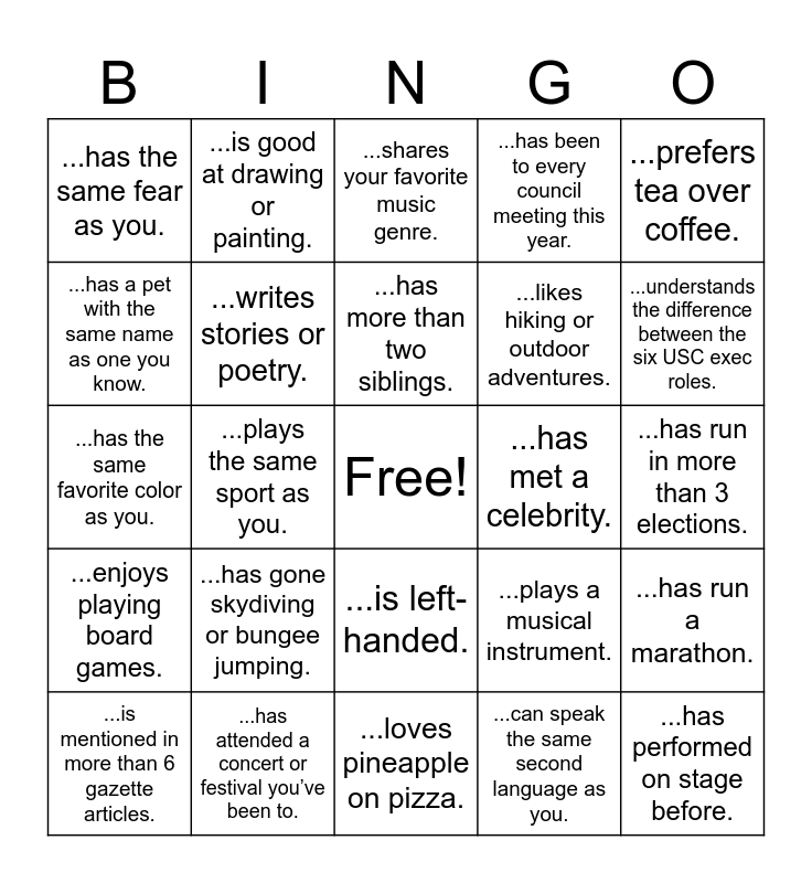 This bingo card has a free space and 30 words: ...has attended a concert or festival you’ve been to., ...has the same zodiac sign as you., ...plays the same sport as you., ...has traveled to the same country as you., ...has the same fear as you., ...shares your favorite music genre., ...writes stories or poetry., ...is left-handed., ...has met a celebrity., ...loves pineapple on pizza., ...has run in more than 3 elections., ...has performed on stage before., ...can speak the same second language as you., ...was born in the same month as you., ...understands the difference between the six USC exec roles., ...shares your dream travel destination., ...plays a musical instrument., ...enjoys playing board games., ...has gone skydiving or bungee jumping., ...prefers tea over coffee., ...has the same favorite color as you., ...has the same favourite movie as you., ...is good at drawing or painting., ...likes hiking or outdoor adventures., ...has a pet with the same name as one you know., ...has been to every council meeting this year., ...has run a marathon., ...is mentioned in more than 6 gazette articles., ...has more than two siblings. and ...has slept in the UCC to get work done..