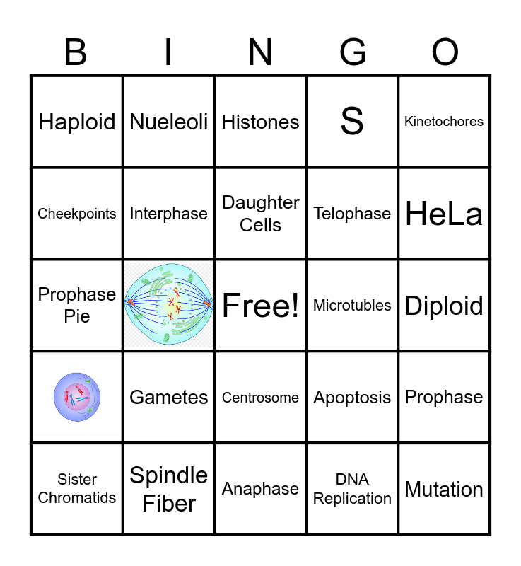 This bingo card has 5 images, a free space and 49 words: Mitosis, Gametes, 23 Chromosomes (Mom), 23 Chromosomes (Dad), Diploid, Somatic Cells, Interphase, G1, S, G2, Haploid, Cytokinesis, DNA Replication, Prophase, Prometaphase, Metaphase, Daughter Cells, Telophase, Chromatin, Sister Chromatids, Spindle Fiber, Anaphase, Microtubles, Kinetochores, Cleavage Furrow, Nueleoli, Centrosome, Cell Wall, Protein, Eukaryotic Chromatin, Chromatid, Actin Filament, Synthesis, Body Cells, Cheekpoints, "Stop", Histones, Apoptosis, Mutation, Prophase Pie, Prometaphase Pie, "Go", Anaphase Pie, Telophase Pie, Cell Cycle Pie, Cancer, Metaphase Pie, Plant Cell and HeLa.
