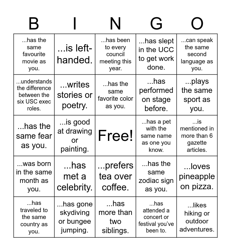 This bingo card has a free space and 30 words: ...has gone skydiving or bungee jumping., ...shares your dream travel destination., ...is good at drawing or painting., ...plays a musical instrument., ...has the same favourite movie as you., ...has been to every council meeting this year., ...writes stories or poetry., ...prefers tea over coffee., ...has a pet with the same name as one you know., ...has more than two siblings., ...is mentioned in more than 6 gazette articles., ...likes hiking or outdoor adventures., ...has attended a concert or festival you’ve been to., ...has run a marathon., ...plays the same sport as you., ...shares your favorite music genre., ...has the same zodiac sign as you., ...was born in the same month as you., ...has met a celebrity., ...can speak the same second language as you., ...has the same fear as you., ...has run in more than 3 elections., ...is left-handed., ...has performed on stage before., ...understands the difference between the six USC exec roles., ...has slept in the UCC to get work done., ...loves pineapple on pizza., ...has traveled to the same country as you., ...has the same favorite color as you. and ...enjoys playing board games..